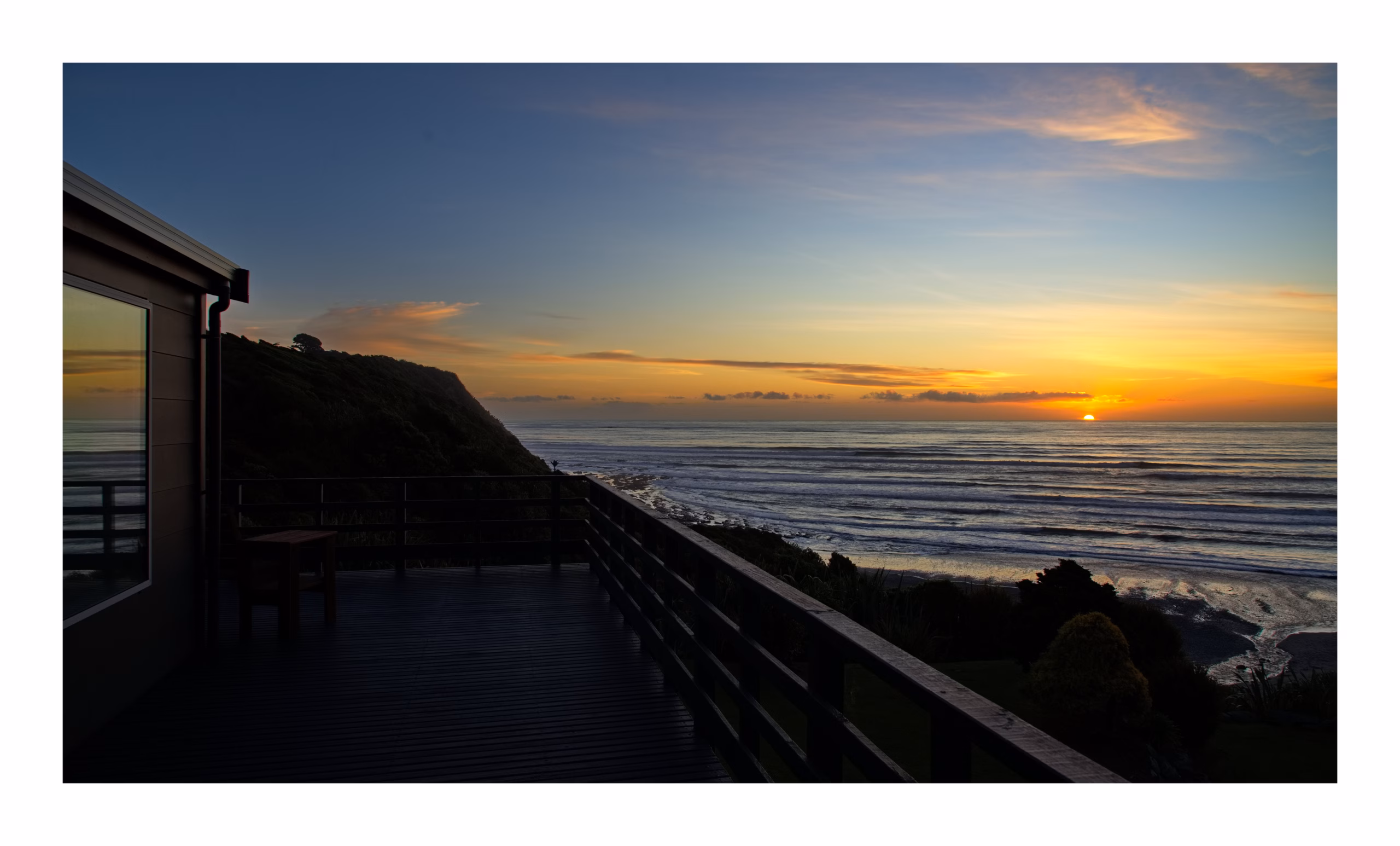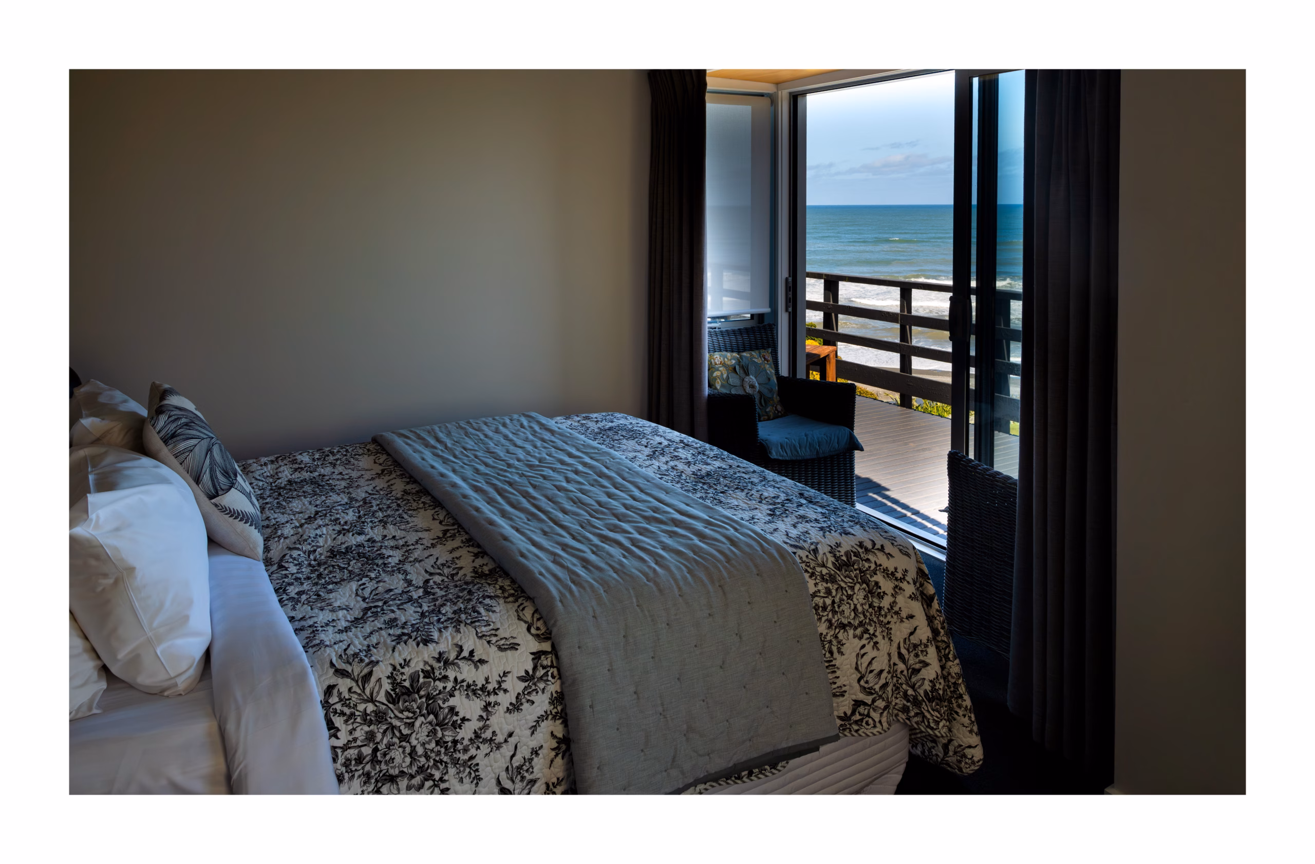Guest rooms all have ensuite bathrooms, indoor seating area, outdoor balcony/deck access with outdoor seating and fantastic sea views. Guests can lie in bed and watch the rolling surf and be lulled to sleep by the sound of the breaking waves. Sit back, relax and enjoy the sea views and watch the sun setting over the Tasman Sea.