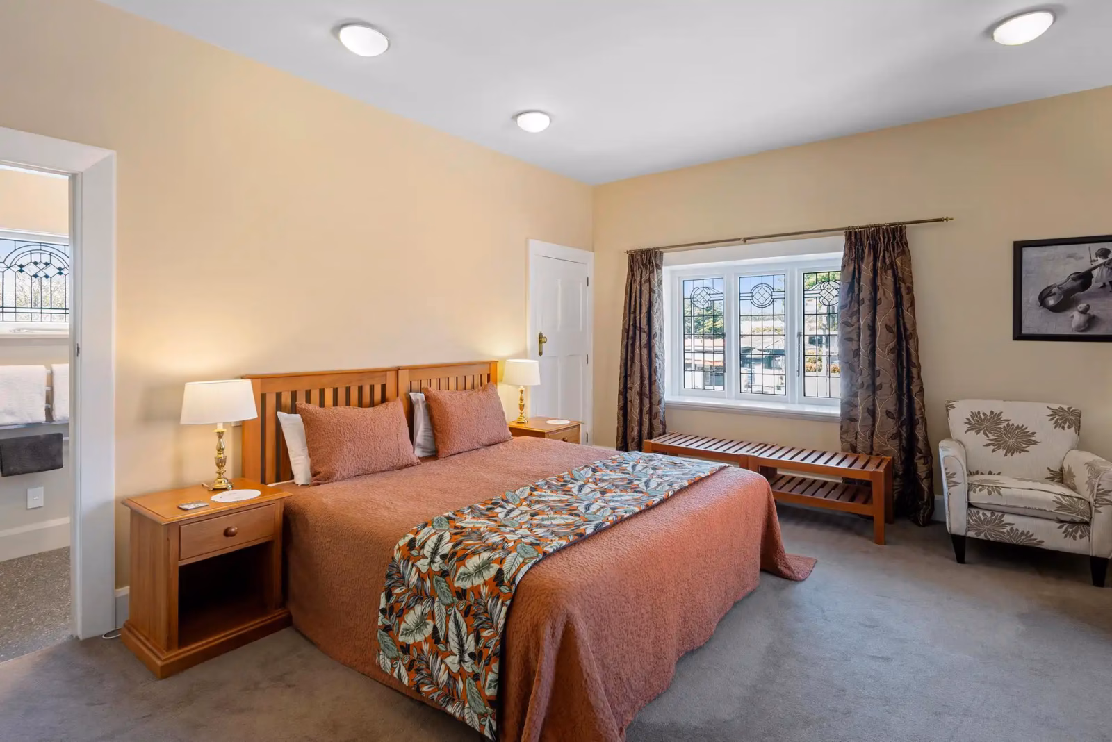 The house still retains all the charm and character of a large New Zealand home of the early twentieth century, with rich Rimu panelling, leadlight windows and for the winter months, the cosy warmth of a fire in the guest lounge. The guest lounge has a good sized modern grand piano suitable for all visiting musicians.